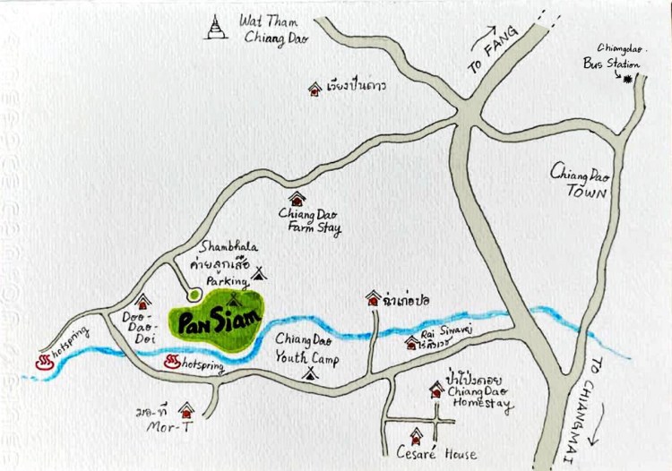 The campsite located in the venue is surrounded by big trees, small stream, sitting just beside Doi Luang Chiangdao, one of the Biosphere Reserve in Thailand. Nearby are both private and public hotsprings (10 mins walk) run by the community.